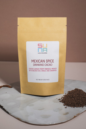 Our Mexican spice drinking cacao is made with cacao beans harvested from a single estate in Tabasco, Mexico, a region with a cacao-growing tradition stretching back to ancient Mesoamerica. This cacao lavado is prepared at the estate using a traditional local method of washing the bean, which retains its unfermented state, allowing the bean to retain a high amount of flavonols and polyphenols. We lightly roast to develop flavor and then craft the chocolate with a blend of spices, including organic Ceylon cinnamon, organic Madagascar vanilla, and locally grown organic cayenne from the Verde Valley. Directions: Mix 2.5 tbsp. (32 g) with milk of choice or with water. We suggest bringing your liquid of choice to just under a boil, then turning off the heat, and whisking in the chocolate grounds.