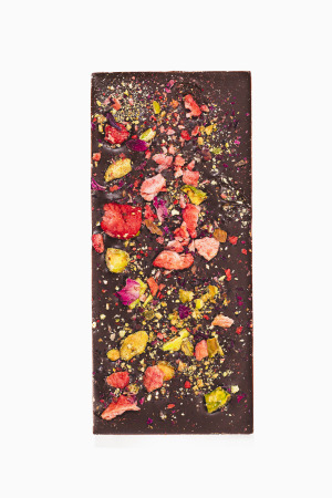 Rose petals, Arizona pistachios, and strawberries atop rich cacao from Semuliki Forest, Uganda, to complement its dark brownie notes. Our first bar creation and our most popular.
