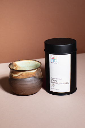 We collaborated with Madeleine at Mija Apothecary/Bluebird Farms to create this gift set. Inspired by darker clay bodies found in Mexican ceramics and Korean celadon, Madeleine crafted these drinking vessels that feel so good cupped in the hands when sipping our cacao. Stamped with both the Bluebird Farms bird and SUNA on opposite ends of the bottom of the cup. One-of-a-kind and very limited. We offer the cup and a tin of one of our organic dark chocolates (either 72% Uganda Semuliki Forest or 70% Zorzal Dominican Republic) in a gift box. Please note your choice of drinking chocolate when placing your order. Included in container in compostable clear bag.