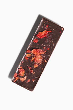 A 55% dark oat milk wild Bolivian heirloom cacao topped with freeze-dried strawberries and sprinkled with vanilla. We offer it in a mini version because it's just so cute. Kids go wild for this bar as does the inner child. 25 grams. Vegan. GF.