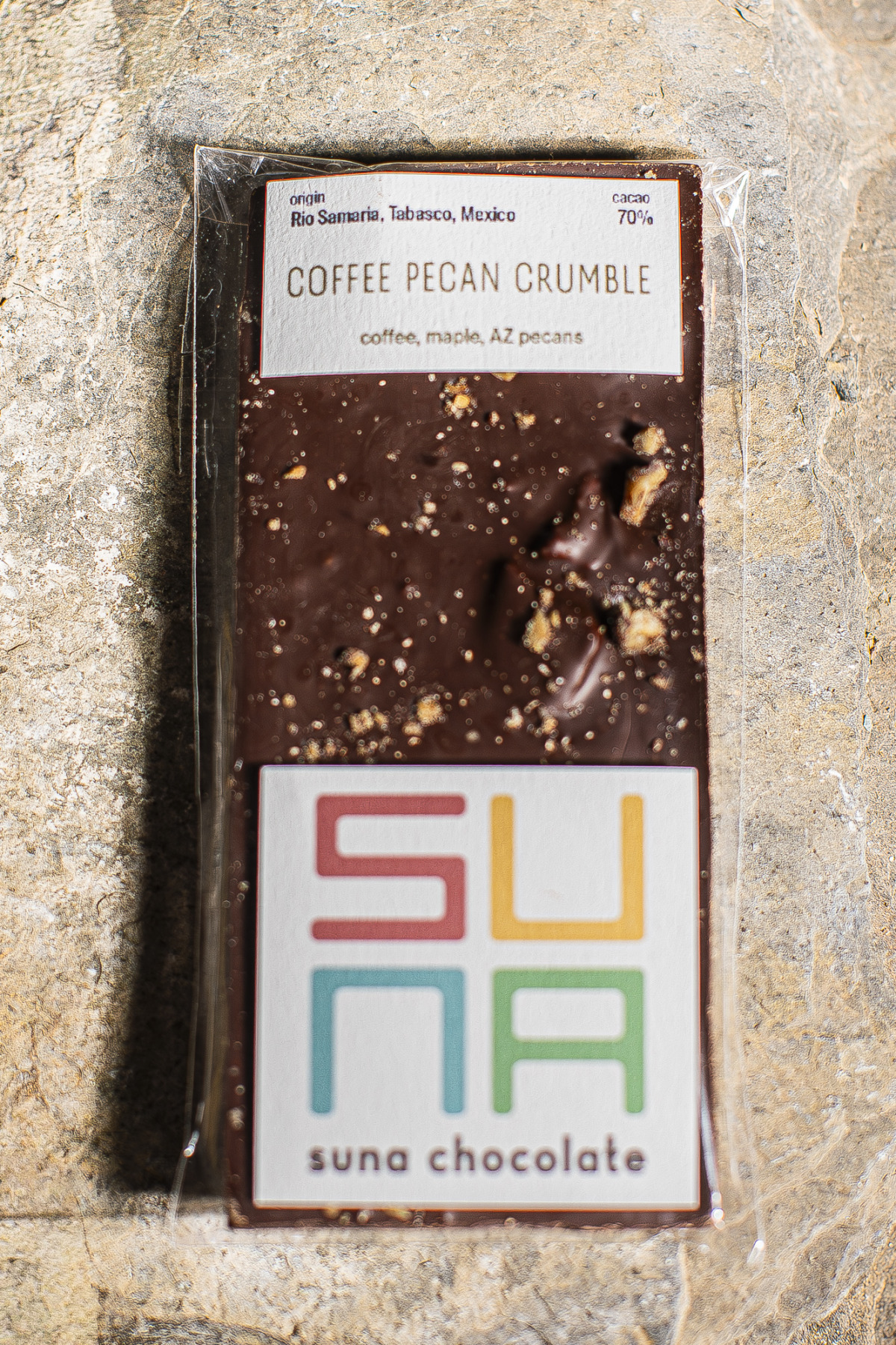 Camp Verde pecans steeped in Sedona-roasted Brazilian coffee and candied in maple syrup combine with the robust notes of Rio Samaria Tabasco cacao from Mexico.